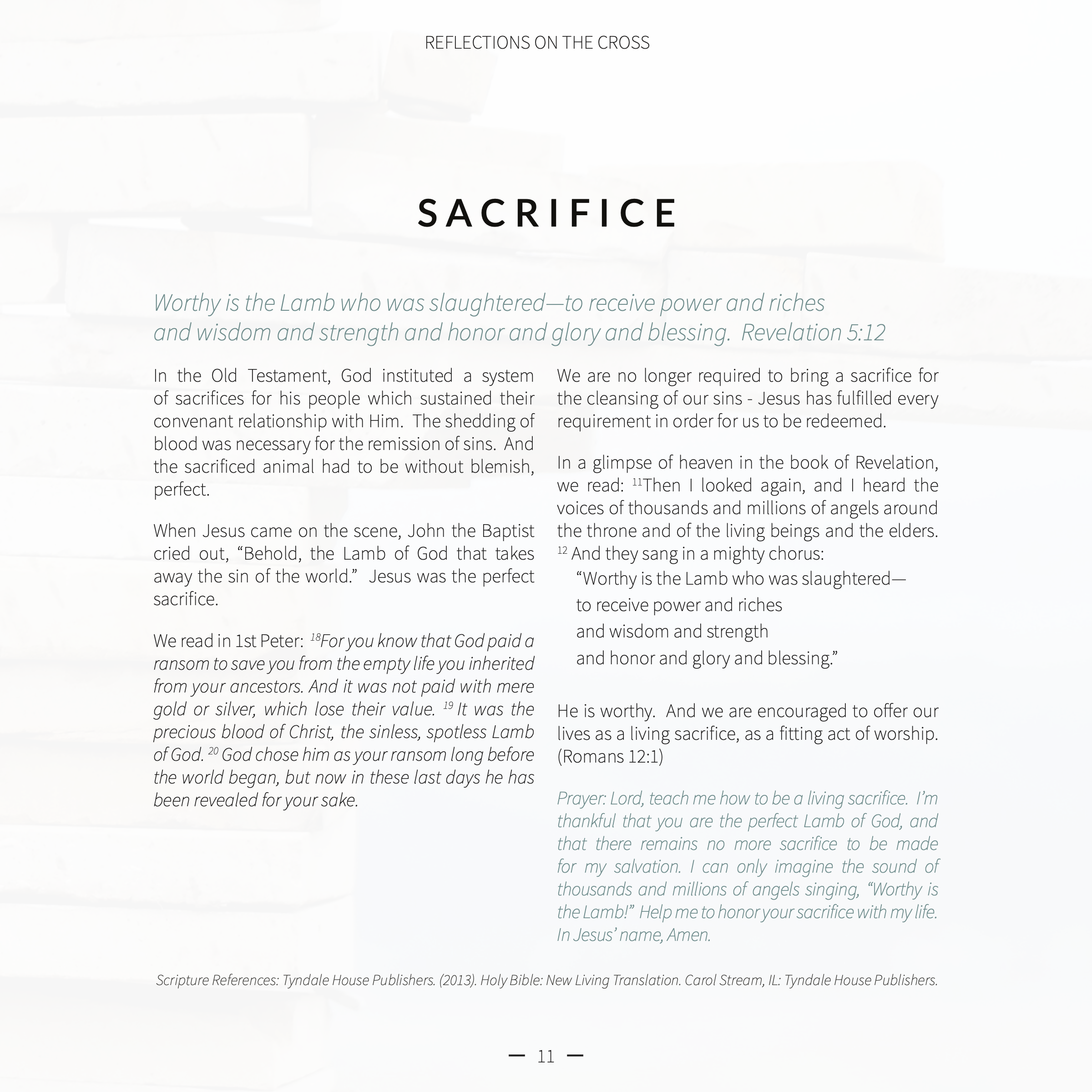 Prayer: Lord, teach me how to be a living sacrifice. I’m thankful that you are the perfect Lamb of God, and that there remains no more sacrifice to be made for my salvation. I can only imagine the sound of thousands and millions of angels singing, “Worthy is the Lamb!” Help me to honor your sacrifice with my life. In Jesus’ name, Amen.