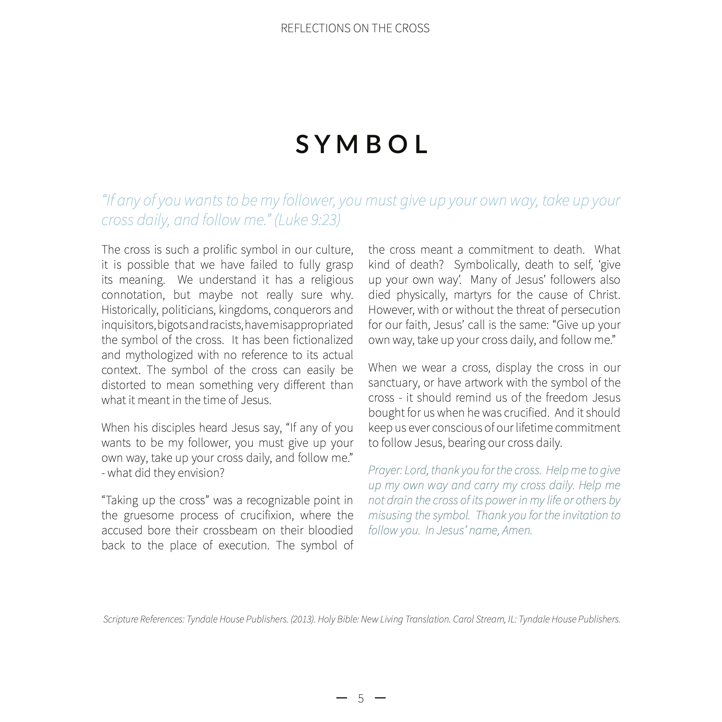 Prayer: Lord, thank you for the cross. Help me to give up my own way and carry my cross daily. Help me not drain the cross of its power in my life or others by misusing the symbol. Thank you for the invitation to follow you. In Jesus’ name, Amen.